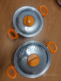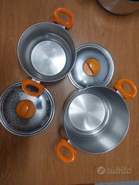 bellissima batteria di pentole VINTAGE Anni 70 in acciaio con manici arancio qualcuna è stata usata tenuta in perfette condizioni