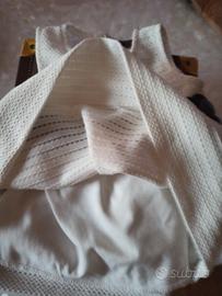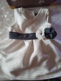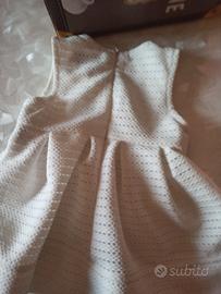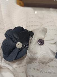 Abitino bimba color panna con metà cintura blu sul davanti con fiori in tessuto, dietro chiusura con cerniera. Tutto è foderato in tessuto panna.La metà circonferenza della vita è di 22 cm , lunghezza 35 cm. Tessuto con lievi trafori orizontali alternati al tessuto lavorato.