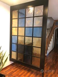 Vetrata artistica per interni con 24 pannelli in vetro di lavorazione artigianale. Altezza cm 249 (compresa staffa di sostegno) larga cm 151, profondità da cm 4,7 . Struttura in legno di colore nero . Ottimo stato.