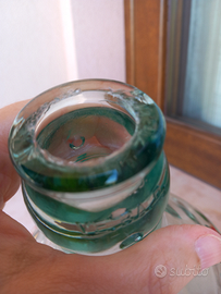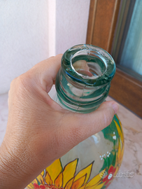Boccione da 5 litri; dimensioni 31x20 cm. Vetro bianco. Decorato con smalti acrilici e stucchetto materico dorato. È un complemento di arredo x interni. Teme i graffi, quindi va pulito con un panno morbido e acqua; NO spugnette abrasive, NO solventi. È un oggetto recuperato e può aver tracce dell'uso precedente. Il disegno è esclusivo.