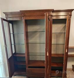 Vendesi vetrina 3 ante con cassetti. Totalmente in massello di noce con intarsi, schienale rivestito in stoffa. Ripiani in cristallo da 8 mm, vetri molati. Cassetti a coda di rondine con fondo in massello. € 400 poco trattabili. No perditempo