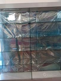 Vendo vetrina alta di cristallo temperato con 4 faretti alogeni e con 4 ante scorrevoli. Larghezza cm 182 altezza cm 188 profondità cm 46