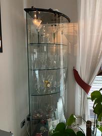 Vetrina angolare interamente in cristallo, con ante bombate, completa di 4 mensole in cristallo e due faretti. Per ulteriori informazioni o foto non esitare a contattare