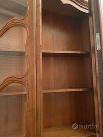 Parte superiore: Vetrina a due ante con vetri sagomati, cornici intagliate e 2 ripiani interni (3 vani complessivi).