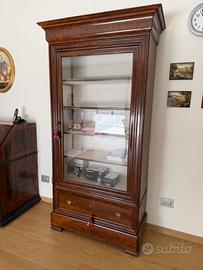 Vendo come da foto per svuotamento abitazione splendida vetrina antica. Distinta per le sue proporzioni raffinate e il suo straordinario stato di conservazione originale, questa armoire del periodo American Empire rappresenta il vertice dell’artigianato urbano dell’inizio del XIX secolo.L’imponente mobile è rivestito con splendide impiallacciature di mogano fiammato book-matched, disposte in motivi drammatici che esaltano l’eccezionale qualità di questo pregiato legno.Alta circa 198 cm (6,5 piedi), l’armadio presenta un imponente coronamento a timpano spezzato, tipico dei migliori esemplari Empire. La porta singola incorpora l’originale vetro e conserva tutta la ferramenta in ottone d’epoca, tra cui un rarissimo pomolo originale con nappa di seta, perle di legno intagliate e una bocchetta della serratura a foglia d’acanto.L’interno offre un’ampia capacità di stoccaggio grazie a numerosi ripiani, ideale per riporre biancheria fine o indumenti. Il cassetto singolo alla base fornisce ulteriore spazio, mantenendo la sua originale maniglia in ottone.Questa magnifica armoire sarebbe un’aggiunta straordinaria per qualsiasi collezione seria di mobili americani o un imponente pezzo di arredo in una dimora tradizionale. Le sue dimensioni imponenti e il suo perfetto stato di conservazione la rendono un reperto sempre più raro sul mercato attuale.