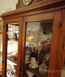 Vetrina antica in legno pregiato di ciliegio con intarsi e vetri smaltati lavorati con cassetti in condizioni eccellenti. Dimensioni 187x40x100