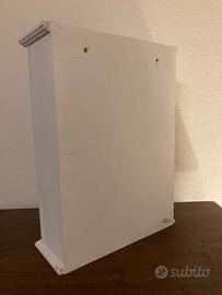 Piccola vetrina bianca in legno. Da parete o da appoggio. Ideale per contenere profumi o farmaci. O per esporre piccoli oggetti.