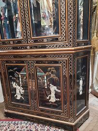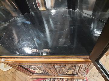 mobile bar, vetrina cinese antica, lacca e decorazioni dipinte e a rilievo, angolare. dimensioni: h 210 cm più 20 cm di guglia, profondità 50 cm larghezza 110 cm ripiani in cristallo base esagonale, angolare. ritiro Venezia, Santo Stefano, San Marco