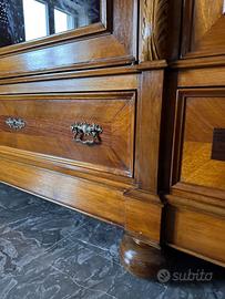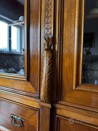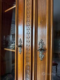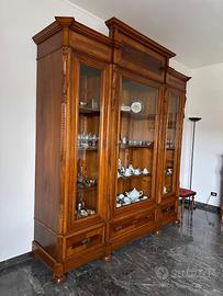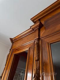 Vetrina classica in legno pregiato con elementi intagliati, epoca ottocentesca, caratterizzata da tre ante vetrate nella parte superiore e tre cassetti inferiori con intarsi decorativi. Presenta piedini torniti e una cornice superiore modanata, tutta completamente restaurata anni fa. Misure 220x60 h 255 (parte centrale) - h 235 (laterali) Utilizzabile come mobile contenitore da esposizione per cristalleria, porcellane o libri. Contattatemi per altri dettagli