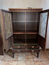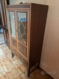 Vetrina/credenza alta in legno con ante a vetro piombato e ripiani interni.