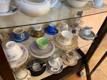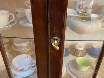 Vetrina con tazze e tazzine da collezione, con piattini. Tutti pezzi favolosi. Mobile in buone condizioni. Tazzine in perfetto stato.