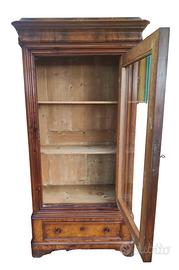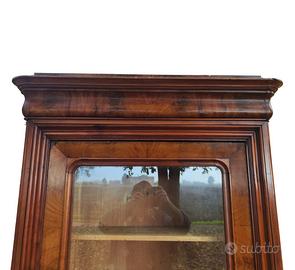 Particolare e scenografica vetrina cristalliera libreria dispensa Carlo X Cappuccina in noce massello e piuma di noce su abete, costruita in ambito piemontese nella seconda metà del XIX secolo.