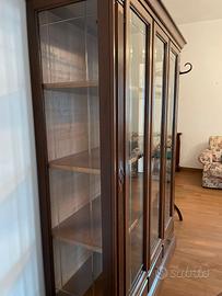 Mobile in legno massello adatto ad un arredo in stile classico arte povera a prezzo di fabbrica. Si tratta di mobili completamente in legno massello di prima qualità. Non ci sono parti in plastica o truciolare. Vetrina stile arte povera 3 porte 3 cassetti, 4 ripiani interni. Cornice dritta sporgente, zoccolo inferiore pieno sporgente. Vetrine presenti su tre lati del mobile. Smontabile Color noce RITIRO IN ZONA a carico dell'acquirente