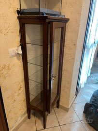 Vetrina in legno e tulipe’ , con ripiani in vetro e interno in stoffa damascata panna, fattura italiana, colore moro, misure aA150cmxL45cmxP32cm,Vendita per trasloco imminente .ritiro solo in loco