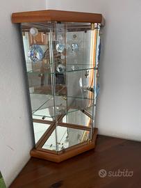 Vetrina ad angolo da tavolo come nuova in vetro con il bordo di legno.