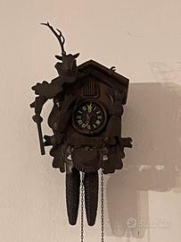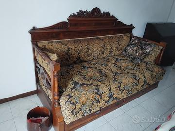 vetrina e divano in legno massiccio,lavorata a mano in buone condizioni,armadio anni 50,credenza anni 40,culla anni 40 e orologio da muro a cucu' anni 40.