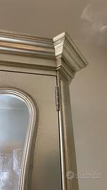 Le ante, in vetro trasparente permettono di esporre cristalli, porcellane o oggetti decorativi. All’interno si trovano ripiani in vetro illuminati da faretti LED che esaltano ulteriormente la brillantezza della finitura esterna.