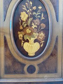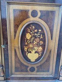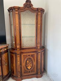 Vetrina in legno massello lavorazione artigianale con intarsi, stile barocco. Intarsi, rivestimenti interni e decori di pregio. Perfetto stato. Misure: altezza 210cm, Larghezza 110cm, Profondità 45cm. Possibilità consegna a Roma