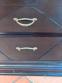 Il mobile è caratterizzato da linee classiche, finitura lucida e maniglie in metallo dorato.