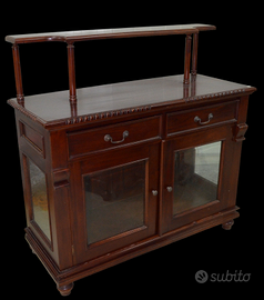 Bellissima credenza interamente in massello di mogano, con due cassetti e due ante, utilizzabile anche come vetrina per via delle ante a vetri e dei vetri anche sui lati. Ripiano al di sopra del piano del mobile sorretto da colonnine. Queste le misure: altezza cm 89 e 119 al ripiano, lunghezza cm 120, profondità cm 50.