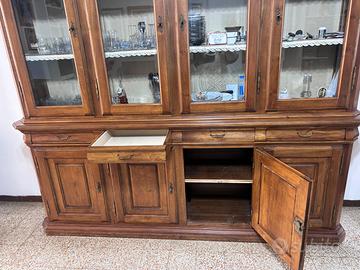 Vetrina in noce massello dal design elegante e funzionale, ideale per arredare con stile ambienti classici o contemporanei. La struttura è suddivisa in quattro ampie vetrine superiori con ante in vetro, perfette per esporre servizi di piatti, bicchieri, libri o oggetti decorativi, proteggendoli dalla polvere e valorizzandoli visivamente.