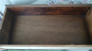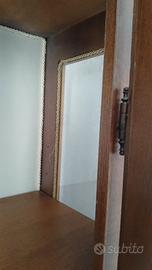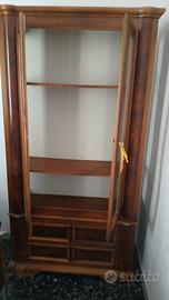 Vetrinetta in legno noce e inserti in radica di noce. Tre ripiani e due cassetti con pomelli in bronzo. Rivestita internamente. Può essere utilizzata come libreria o piccola credenza. Molto funzionale. Lavorazione artigianale italiana. Altezza 1,83 larghezza 97 cm.