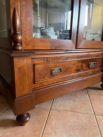 Antico armadio di inizio ‘900, completamente restaurata e trasformato in una vetrina con vetri decorati e cassetto interno foderati come lo schienale. Le mensole in vetro donano leggerezza ed eleganza.