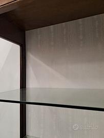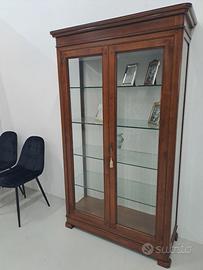 Vetrinetta in vero legno costruita con metodo artigianale, vetri con bordo diamantato, ripiani interni vetro traparente e schienale tappezzato, chiusura ante con chiave e bacchetta interna, particolari con chiodi in legno sugli angoli esterni, larg. 112 prof. 41 h. 190, escluso trasporto