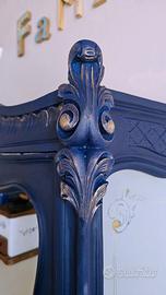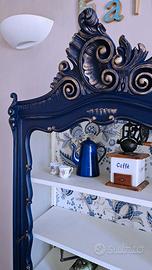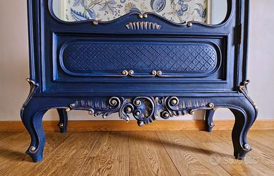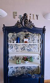 PEZZO UNICO Non una semplice vetrina, ma un elemento di design unico nel suo genere. Il mobile ha subito un restauro conservativo profondo, partendo dalla messa in sicurezza del legno tramite trattamento professionale antitarlo eseguito da una ditta specializzata. È stata eseguita una stuccatura generale delle parti piu esposte, mentre alcuni fori di tarlo sono stati mantenuti volutamente per preservare il fascino del mobile antico e l'autenticità del legno. Finitura blu profondo con dettagli in oro che esaltano gli splendidi intagli realizzati a mano. Interno rivestito con carta parati a motivi floreali coordinati. Sostituzione della passamaneria interna di rifinitura. Ferramenta originale. Attualmente la vetrina è stata allestita "a giorno" (senza vetro frontale) per un effetto libreria moderna, ma viene fornito incluso nel prezzo il vetro originale dell’anta: un vetro di valore, sagomato, opaco e finemente decorato (come i vetri laterali). La vetrina si adatta a qualsiasi stile di arredamento o destinazione d'uso come: libreria, ingresso, ufficio, vetrina espositiva negozio bar ecc... Misure: 110 cm schiena 95 cm frontale 40 cm profondità 195 cm altezza max fregio Prezzo trattabile