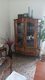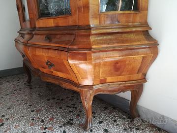 Vetrina Luigi XV finemente lavorata e intarsiata. 2 ante in vetro e 4 cassetti alla base. Misure ingombro massimo: 134 x 38 h 180. La vetrina è composta da due pezzi e si trova attualmente smontata e accuratamente imballata, pertanto l’acquirente, dopo averla visionata, potrà usufruire dell’imballo per un trasporto sicuro.