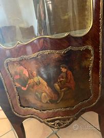 Vetrina francese in stile Luigi XV. vetrina francese del XX secolo in legno di re, con profilo a serpentina e montature in metallo dorato, porta e lati vetrati con pannello dipinto in stile Vernis Martin, sollevata su quattro gambe cabriole. Interno rivestito in tessuto e ripiani in vetro.