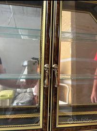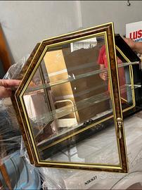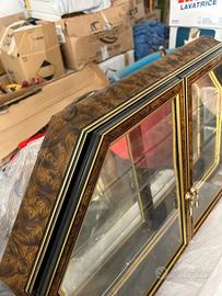 Bellissima vetrinetta da muro, perfetta per esporre oggetti da collezione o decorativi. RITIRO A MANO PARTINICO - Struttura in legno e vetro di colore marrone e oro. - Due ante con maniglie. - Ripiani in vetro. - Design elegante e raffinato.