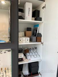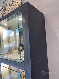 Elegante Vetrine negozio con capienti sportelli, cablaggio faretti incasso e neon laterali.