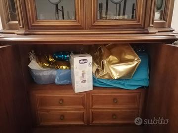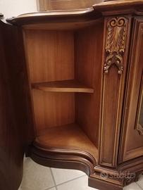 Vendesi a soli 150 euro trattabili (pagata 250) bellissima vetrina con vetri originali e particolari in legno intagliato, a doppia altezza. Parte superiore molto capiente, con 4 sportelli in vetro. Parte inferiore altrettanto comoda con quattro sportelli e cassettiera all'interno del vano coperto dai due sportelli centrali. No tarli, no segni di usura o umidità, pronta da usare o da dipingere per nuovo look. Collocata in taverna a piano terra, raggiungibile con furgoncino o camioncino, ritiro a carico acquirente (si divide con facilità in due parti). No spedizione.