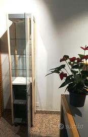 Piccola vetrina (180 h, ripiani 38x42), con faretti, serratura sia per l'anta in vetro superiore che per l'anta che chiude i ripiani inferiori, dotata di ruote con blocco.