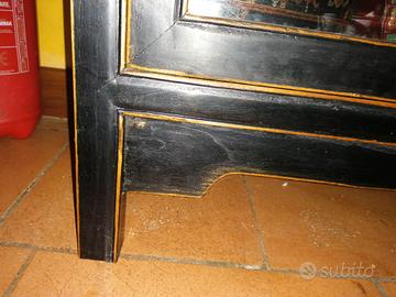 Vetrina Libreria in legno fatta a mano con 2 ante e 5 ripiani, vetro e legno con ferramenta in ferro laccato bronzo, stile etnico chic, di provenienza asiatica. Vendo per cambio arredo ma è bellissima e tenuta bene. Arricchisce la vostra sala o il vostro studio con un tocco di eleganza e raffinatezza di altri tempi. Molto adatta come libreria, porta bicchieri, bar con bottiglie a vista, dispensa. Io ci ho tenuto i cd, i vinili, libri e oggetti da esposizione. Le misura sono altezza 190cm, larghezza 90 cm, profondità 36 cm. È un vero affare, si trova nei negozi di arredamento etnico a 1400€. È un vero mobile in legno e vetro, robusto, solido, resistente. Non come quelli che si trovano smontati con 4 incastri. Qui abbiamo del vero legno massello, lavorato a mano, le mensole e la struttura sono di legno vero. Il colore è un marrone scurissimo quasi nero. La vetrina si trova a Firenze.