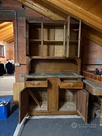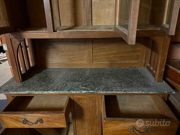 Vendo per inutilizzo mobili da restaurare: vetrina in legno di ciliegio con ripiano in marmo verde. Tre sedie legno ciliegio + due tavole legno di ciliegio. Condizioni discrete, da restaurare. Disponibili da subito. Prezzo trattabile