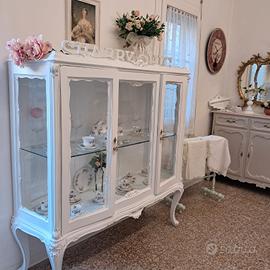 vetrina cristalliera chippendale in legno noce intagliato con restyling shabby chic colore bianco