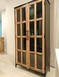Vetrina/Libreria in stile industriale con strutture e ripiani in robusto metallo verniciato nero, ante in legno massello di acacia e vetro.