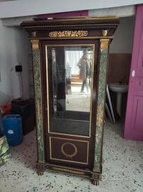 vetrina con colonne stile Napoleone III con anta di vetro centrale e ripiani in vetro con decorazioni in ottone