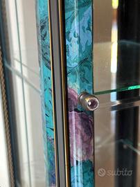 Struttura in legno con motivo floreale tendente al blu e al viola. Ante e ripiani interni in vetro.