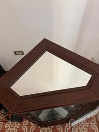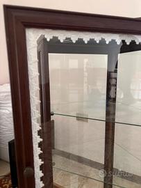 Vetrina vintage in legno e vetro, stile classico con mensole in vetro, base di appoggio in specchio, decoro in merletto. In perfette condizioni