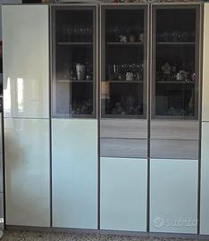 mobile da camera da sala da pranzo composto da 2 colonne dispensa del marchio IMAB (in foto se ne vede una perchè le ho separate), nell'altra foto vedete la composizione inziale ma sono solo due colonne uguali. Il colore struttura è olmo natura, 2 ante in vetro e due ante bianco giallo/ lucido. misura singola colonna 47 larghezza 38 profondotà altezza 215. In aggiunta ho un'altra porta vetrata che può essere messa in sostituzione. può presentare qualche piccola scorticatura nella parte bassa dato dal traspprto ma per il resto sono in ottime condizioni e resistenti