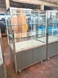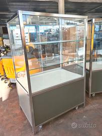 vetrine espositive per articoli costosi usate, si tratta di varie vetrine espositive carrellate con freno utilizzata in negozi/supermercati per tenere sotto chiave articoli costosi come: liquori, telefoni, elettrodomestici, etc. con chiusura a chiave (non disponibile per tutte) anche nella parte inferiore (magazzino cieco). possiamo disporne fino a 100 pezzi. dimensioni: 120X80cm h182cm, interno 113X72cm se ne acquisti più di tre ti faremo un prezzo ad hoc