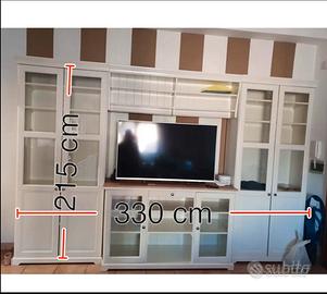 Vendo parete soggiorno componibile Ikea in buono stato composta da : 2 vetrine:misure per la singola vetrina H215 cm L 90/92 cm P37cm Mobile base:H90cm L 145cm P50 cm Mensola:L145cm H40 P max 37cm Prezzo per l’intera composizione 350 con possibilità di vendita di: coppia di vetrine al prezzo di 280 euro Base al prezzo di 150 euro Mensola al prezzo di 100 euro Possibilita di trasporto in base alla destinazione prezzi da contrattare