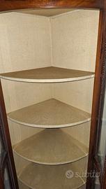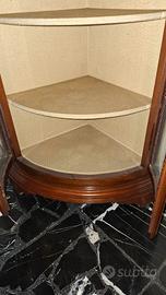 Vetrinetta angolare (cantonale) classica in noce massello, foderata in tessuto, due porte in vetro curvo con serratura, cinque ripiani in legno. Larghezza: 98 cm; altezza: 203 cm; profondità: 49 cm