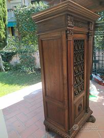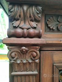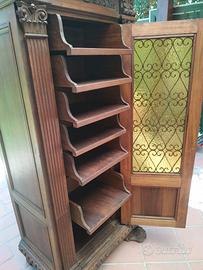 Elegante ed austera vetrinetta anni 30-40; mobile multiuso dotata di 6 cassetti aperti da posizionare in base alle necessità. La struttura è in legno massello intarsiato nella parte superiore e con scanalature e capitello ai lati della vetrina. Due zampe di leone anteriormente, tradizionali quelle posteriori. In base alla posizione dei cassetti può fungere da archivio, mobile bar, libreria come arredo di Studio, Ufficio ecc. L'altezza del mobile è 177 cm, la larghezza di 68 cm (lo spazio occupato in larghezza, considerando la cornice e le zampe di leone, è di 87 cm). La profondità di 45 e, se si considera la cornice e le zampe, di 58 cm. La vetrina è stata sottoposta a trattamento antitarlo.