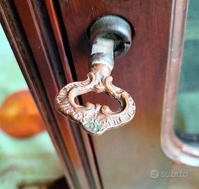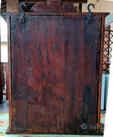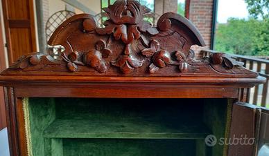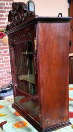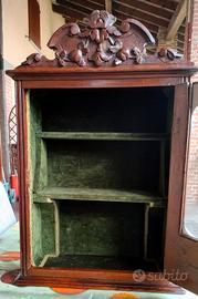 Vendo vetrinetta pensile antica con due ripiani + ripiano di base, oggetto di famiglia da oltre 60 anni. Il cappello e la cornice dell’anta, provvista di chiave, sono finemente intagliati, l’interno è rivestito da vellutino verde bordato con passamaneria. Dimensioni ripiani: 37x6 cm, 37x12 cm, 37x15 cm (LxP) Dimensioni complessive: 68x43x20 cm (HxLxP) Peso: 14 kg circa. La vetrinetta è stata pulita e rifinita con cera per quanto possibile. La chiave è stata lasciata nel suo stato originale antico. Se ne consiglia l’impiego con oggetti non pesanti. Prezzo trattabile. Ritiro diretto.