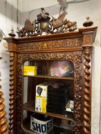 Vendo stupenda vetrinetta antica in legno di noce massello, stile Liberty o Neobarocco italiano, databile tra fine Ottocento e inizi Novecento. Pezzo unico con decorazioni ricchissime e dettagli scultorei.