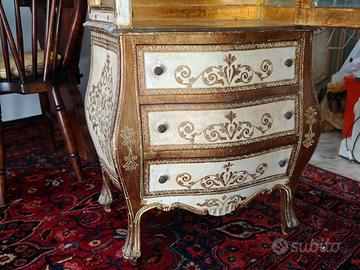 Elegante vetrinetta in stile veneziano, laccata avorio con decorazioni dorate dipinte a mano. Parte superiore con anta in vetro e ripiani interni, base con 3 cassetti sagomati. Struttura solida, ottime condizioni generali con normali segni del tempo. Ideale per salotto o sala da pranzo.